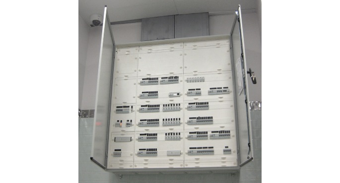 Foi também implementado o sistema de domótica tébis da Hager para controlar a iluminação, estores e ventilo convectores. Nos corredores foram aplicados detectores de movimento Para aparelhagem mural foi seleccionada a série e kallysto.art em vidro branco.